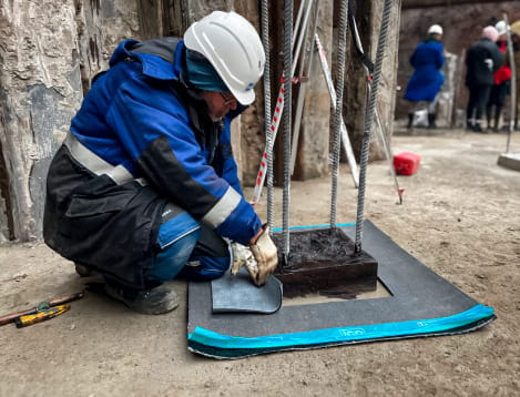 Техническим отделом компании BMI Россия совместно с конструкторами известной архитектурной мастерской «Евгений Герасимов и Партнеры» были разработаны решения гидроизоляции подземной конструкции с учетом возведения здания в условиях плотной городской застройки. Местами расположенные вплотную к наружным стенам ограждающие конструкции котлована не позволяют применять традиционный способ устройства рулонной гидроизоляции стен – наплавление. Поэтому на вертикальных поверхностях применен передовой метод укладки гидроизоляции, так называемая «адгезионная мембрана». В качестве адгезионной мембраны используется материал УЛЬТРАНАП. Благодаря имеющейся на УЛЬТРАНАП посыпке из песка, между бетоном возводимой конструкции и гидроизоляцией образуется адгезия и исключается боковое распространение воды (миграция влаги между гидроизоляцией и изолируемой конструкцией в процессе производства работ). Гидроизоляция фундаментной плиты также является нелегкой задачей, ввиду большого количества свай. На представленных фотографиях специалист технического отдела BMI ICOPAL проводит для строителей шеф‑монтаж узла гидроизоляции сваи. Под фундаментной плитой помимо УЛЬТРАНАП дополнительно использовались битумостойкие гидрошпонки ИКОПАЛ для устройства секционирования гидроизоляции.